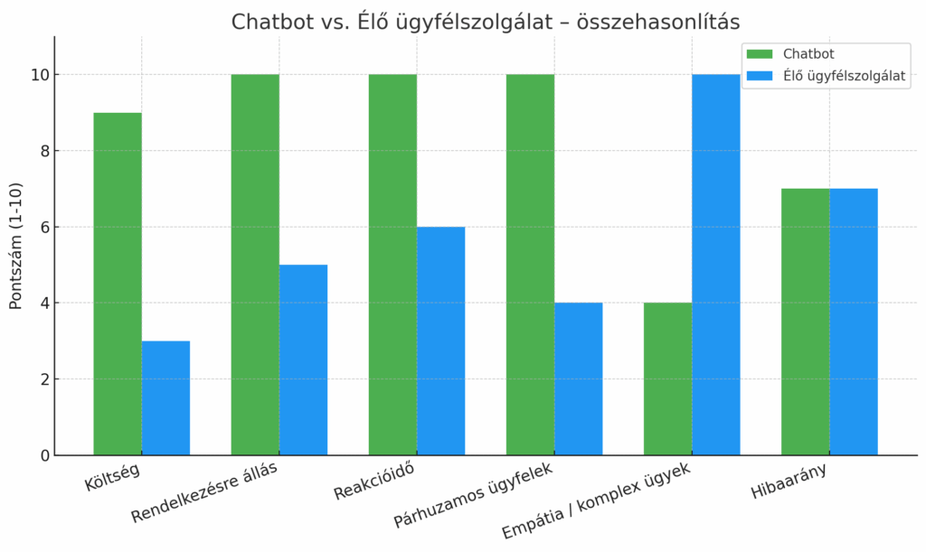 | Szempont | Chatbot | Élő ügyfélszolgálat |